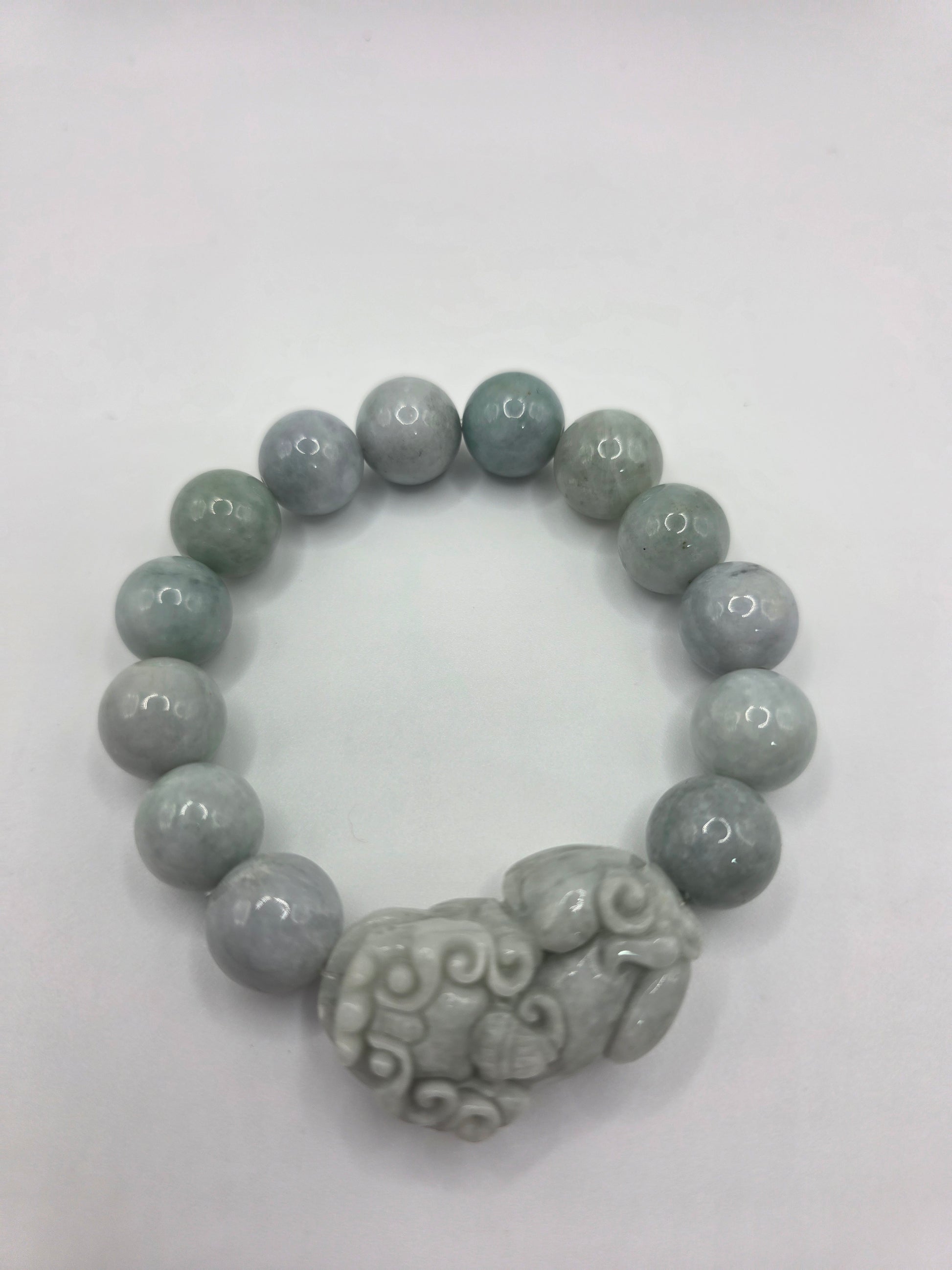 This Jadeite Pixiu bracelet pairs luminous 13mm jadeite beads with a hand-carved Pixiu centerpieceโa mythical guardian said to attract wealth and protect its keeper. The soft green tones shimmer with natural elegance, grounding you in serenity while invoking prosperity and good fortune. Pixiu, revered in Feng Shui tradition, is known as the โfortune beastโ that draws abundance while guarding against negativity. A statement piece that blends sacred symbolism with timeless beauty.