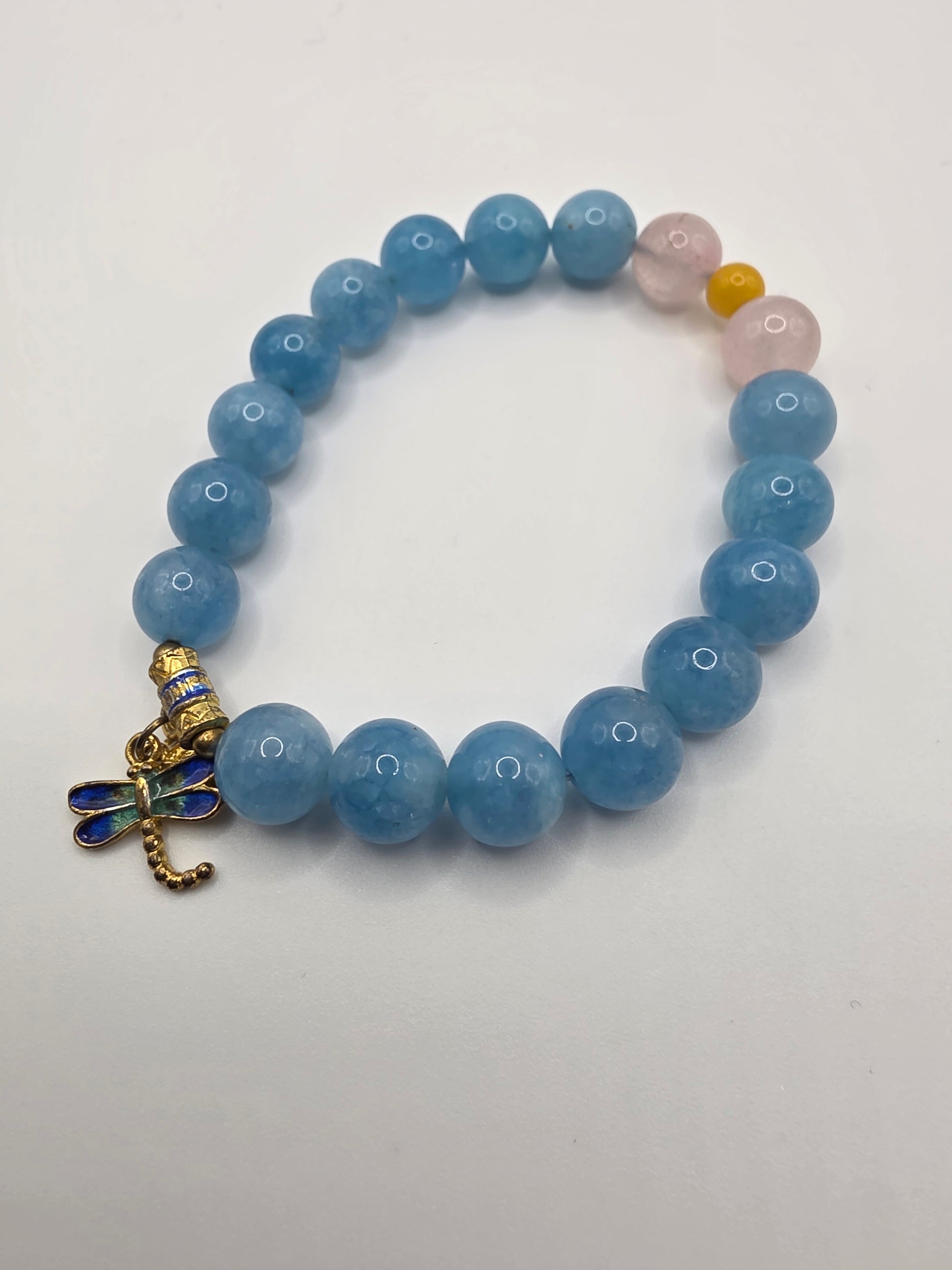 A tranquil blend of soft pink Rose Quartz and sea-blue Aquamarine flows together like the meeting of heart and ocean. Adorned with a delicate firefly charm, this bracelet glows with compassion, courage, and calmโreminding you that even gentle light can guide you home.