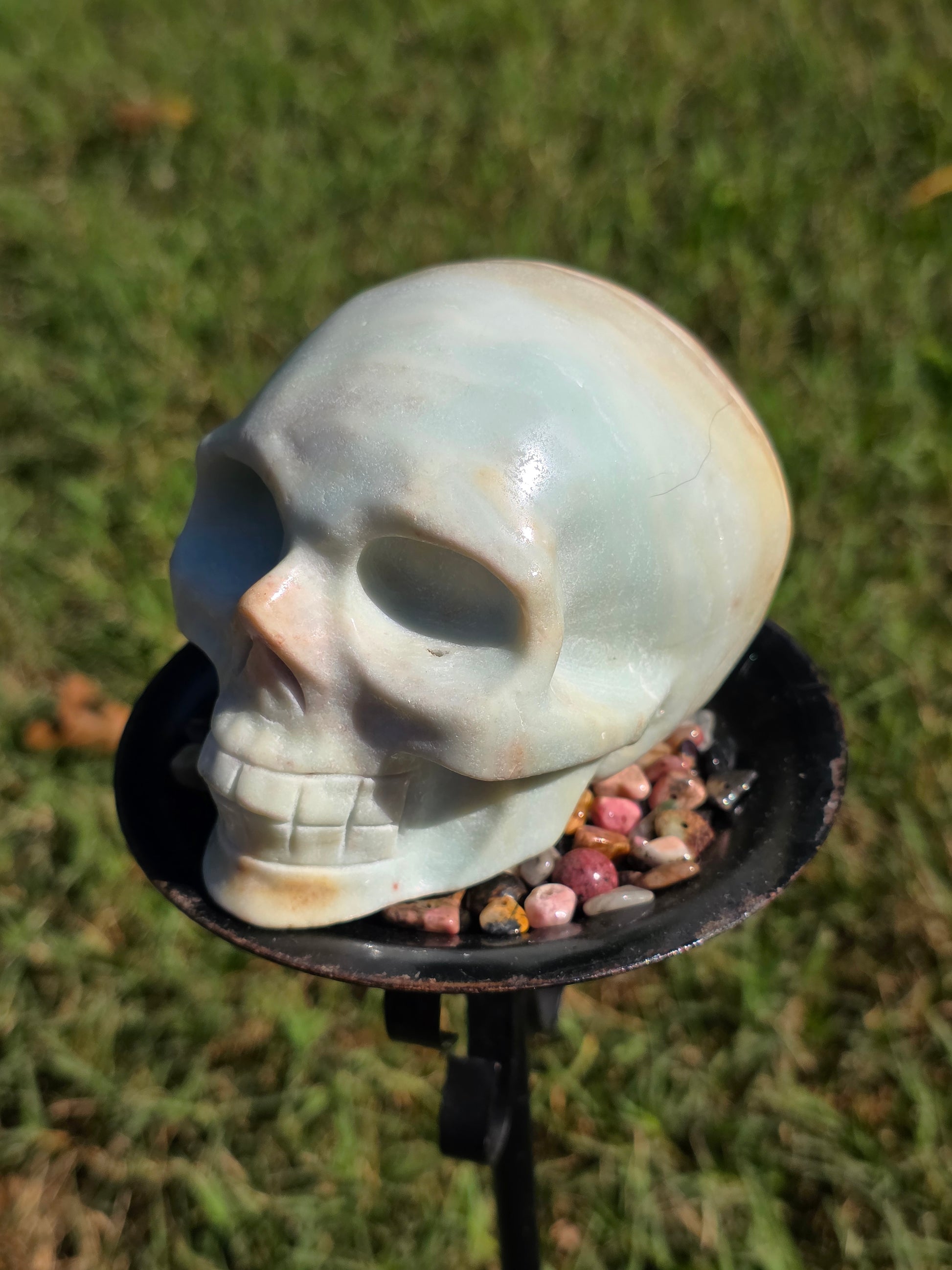 This Caribbean Calcite skull is like holding a piece of paradise. Waves of aqua blue roll across sandy veins, while under UV light it glows with otherworldly magic. A natural fissure crowns its top, a reminder that beauty isnโt perfectionโitโs story and resilience. This skull whispers of tropical shores, inner journeys, and dreamwork under moonlit skies.