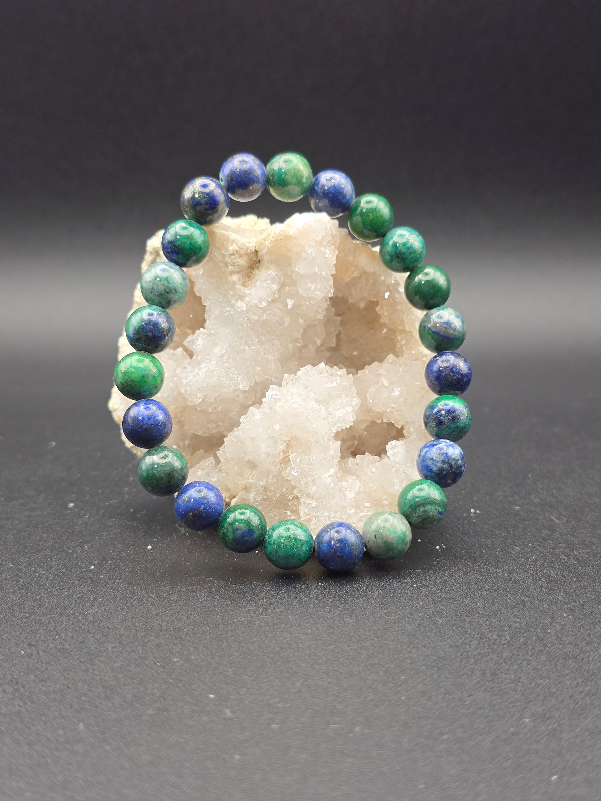 Chrysocollaโs turquoise swirls mingle with the deep midnight blue of Lapis Lazuli, creating a bracelet that feels like waves under a starlit sky. Together, these stones inspire wisdom, communication, and calm emotional flow.