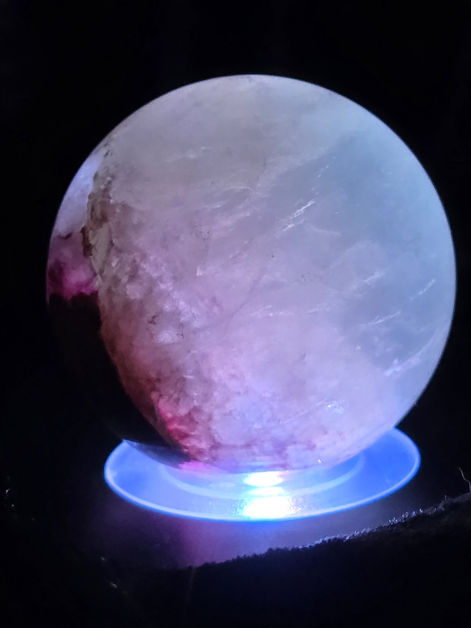 Layers of misty growth swirl inside this sphere like a secret garden, crowned with a rare pink inclusion that steals the show. Under UV light she lights up even more, proving sheโs both mysterious and a little extra. This isnโt your average fluorite โ itโs a one-of-a-kind vibe.
