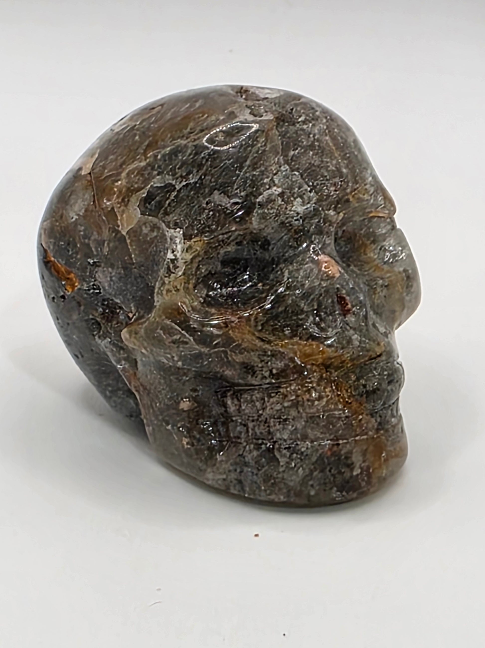Garden Quartz, also called Lodolite, is like holding a miniature world within stone. This skull reveals dreamy landscapes of mossy greens, earthy browns, and crystal-clear windows—each angle a new secret scene. Known for connecting to past lives and the wisdom of nature, it’s a grounding yet mystical ally.