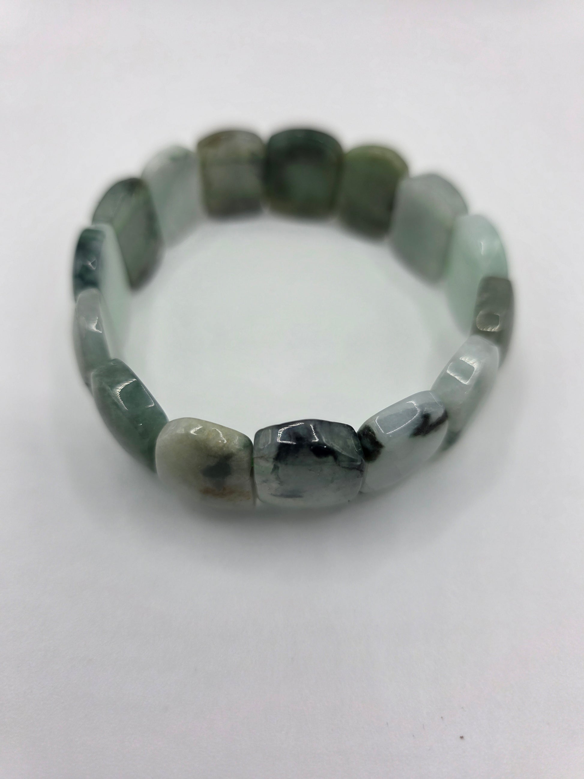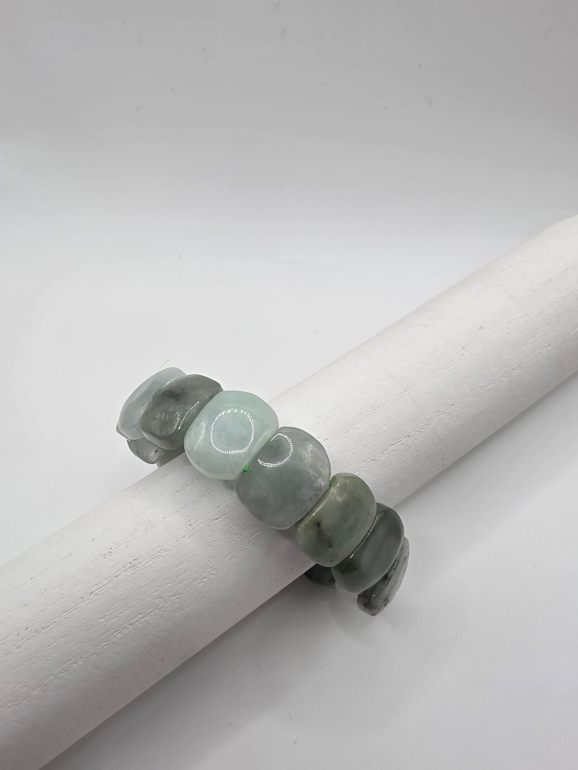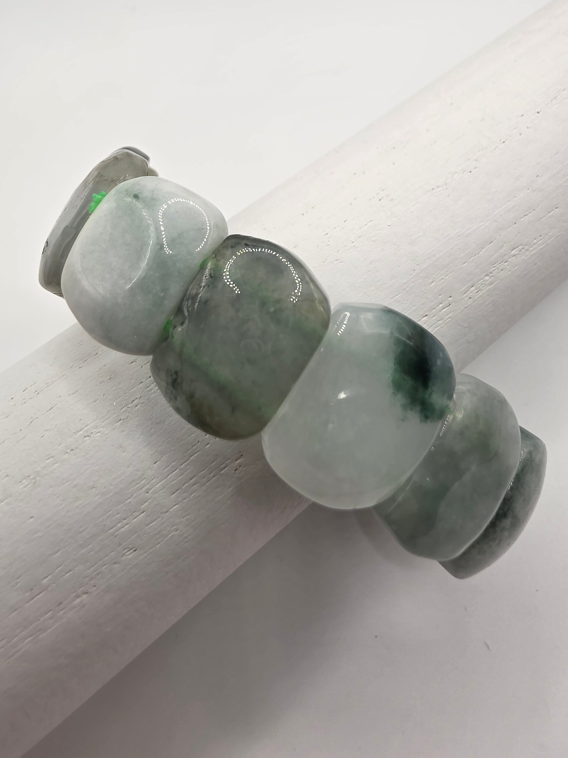 This bold Jadeite oval soft bangle features oversized 19 mm x 14 mm stone segments with elegant sway. Wisps of green flow through a milky base, giving it an ethereal forest-mist beauty. Jadeite has long been revered as a stone of balance, prosperity, and protection โ each movement on your wrist radiates harmony. Wear it with confidence and calm, letting its grounded energy anchor you throughout your day.