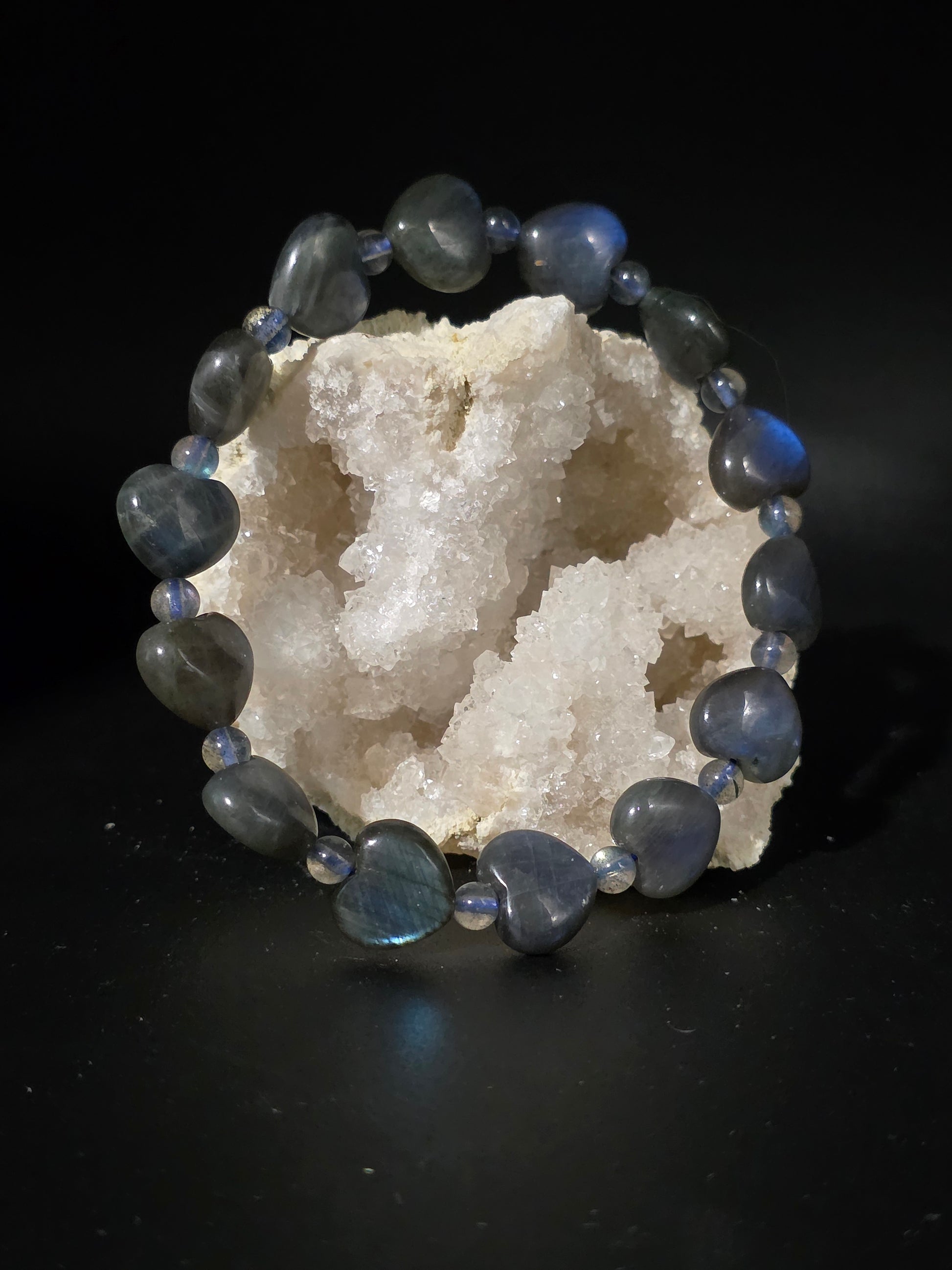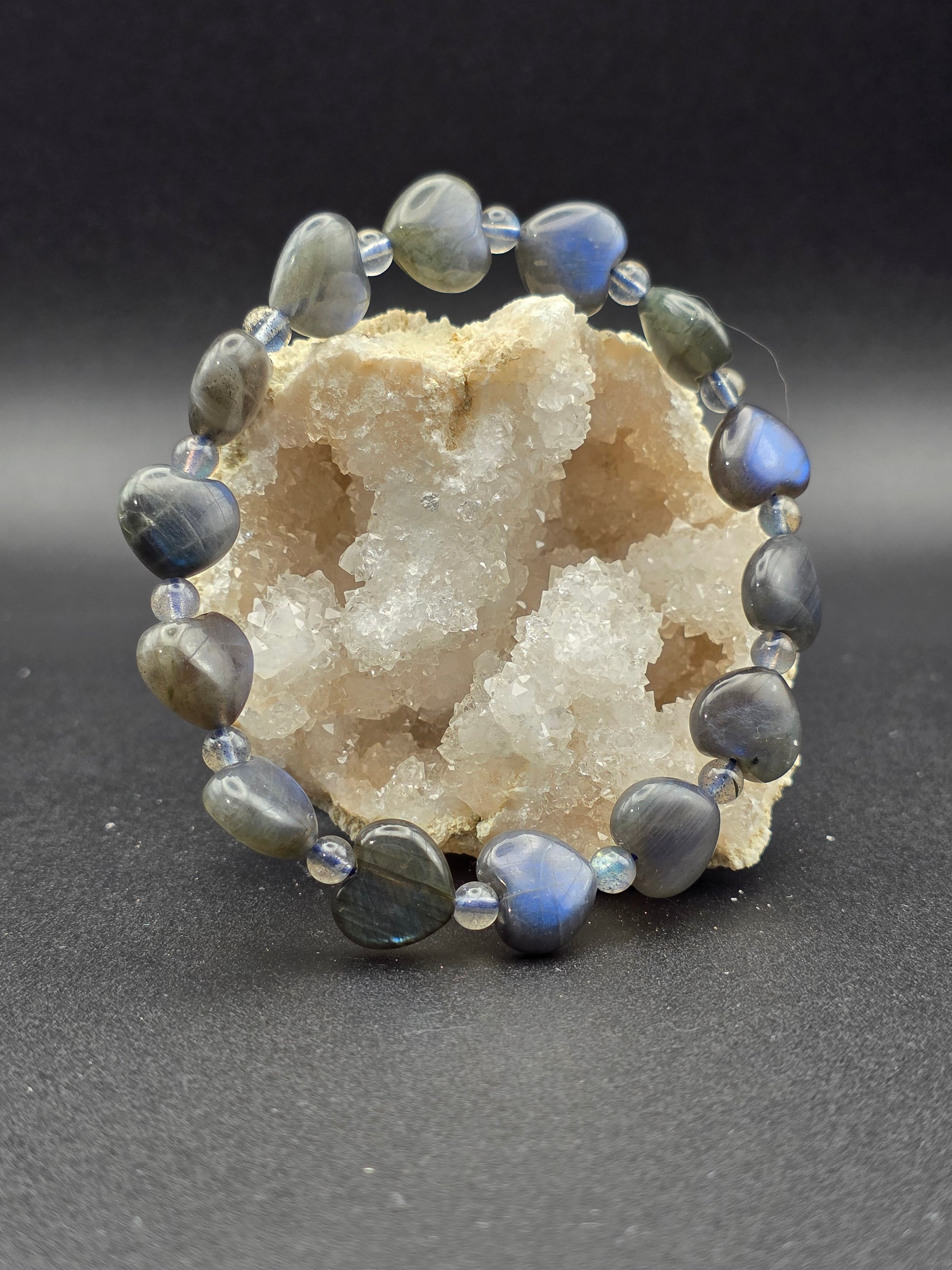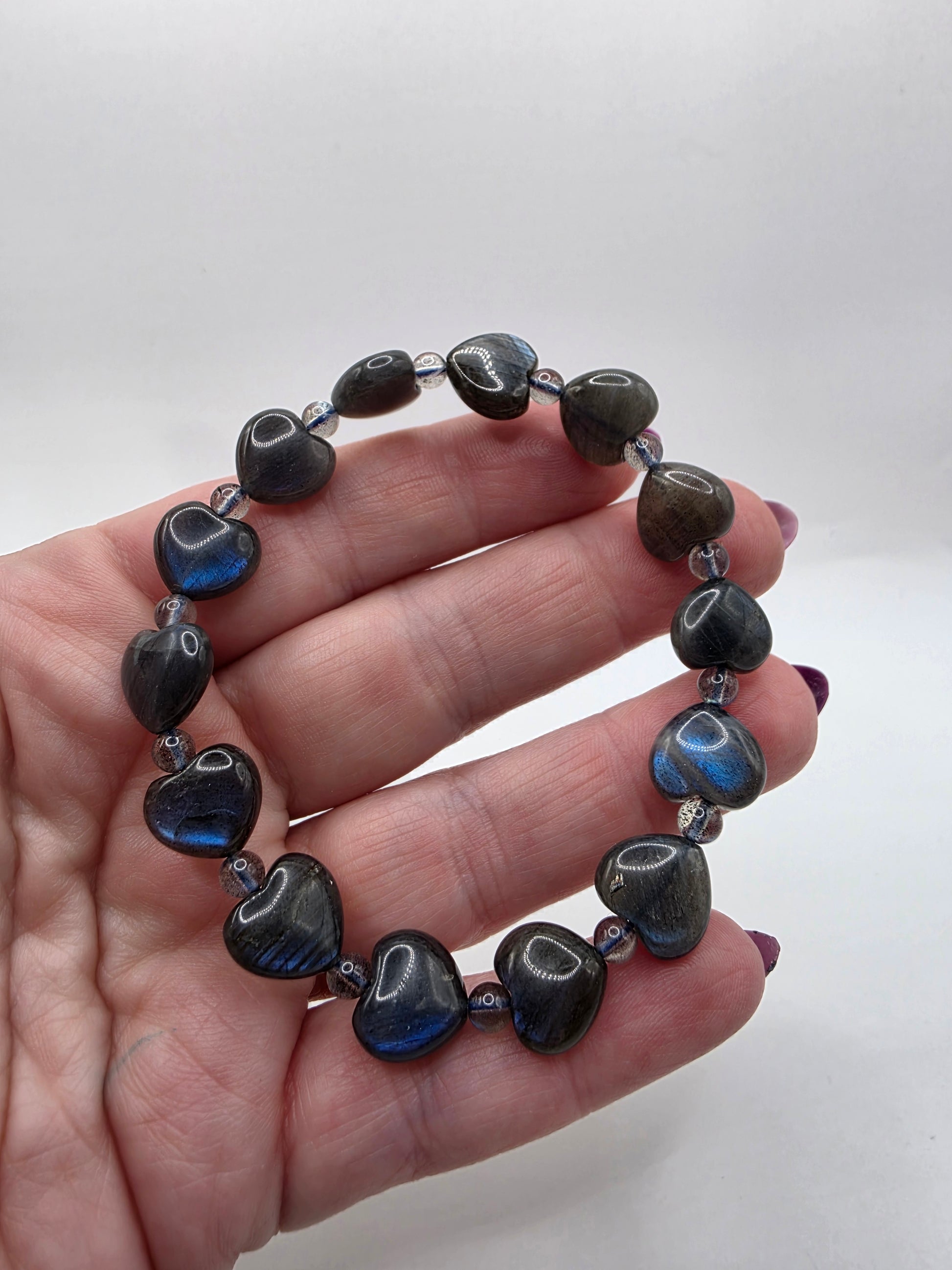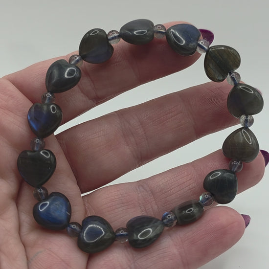 Carved heart-shaped Labradorite beads flicker with light, connecting intuition and compassion. This bracelet blends magic and love, reminding you that your inner glow is your greatest guide.