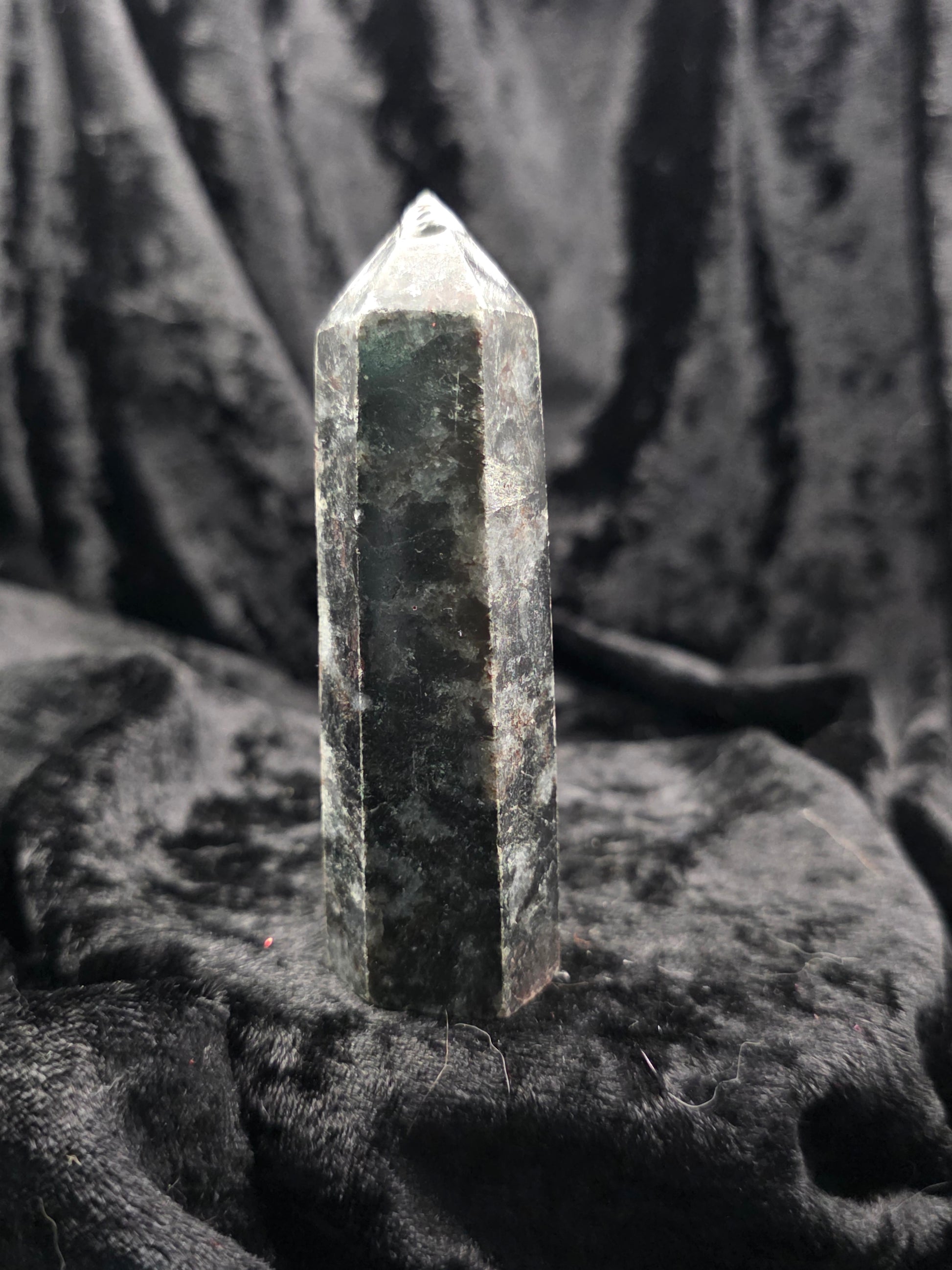 Dark and sleek with flashes of silver and blue, this Larvikite tower sharpens intuition and clears mental clutter. A stone of patience and grounding with cosmic flair.
