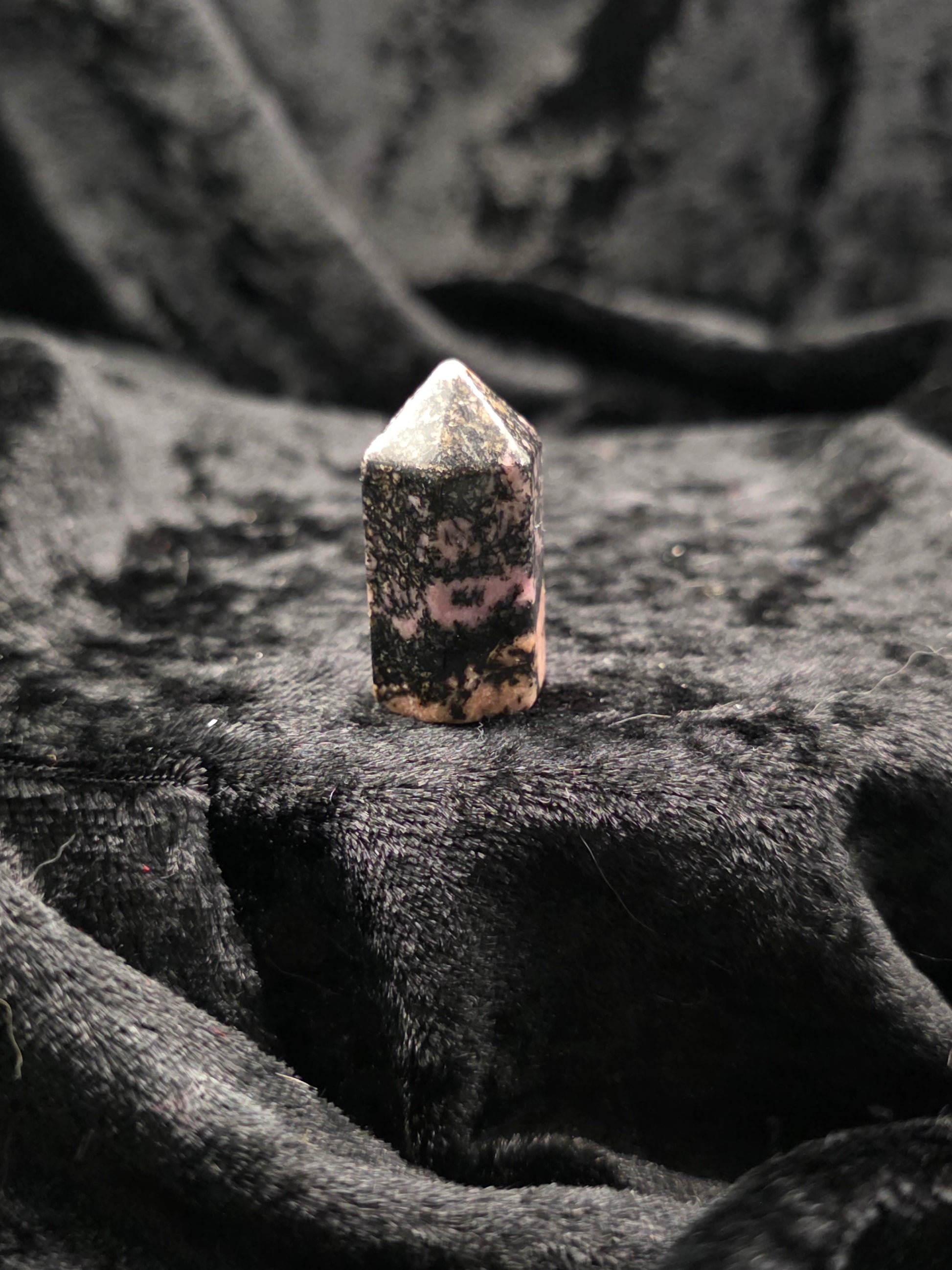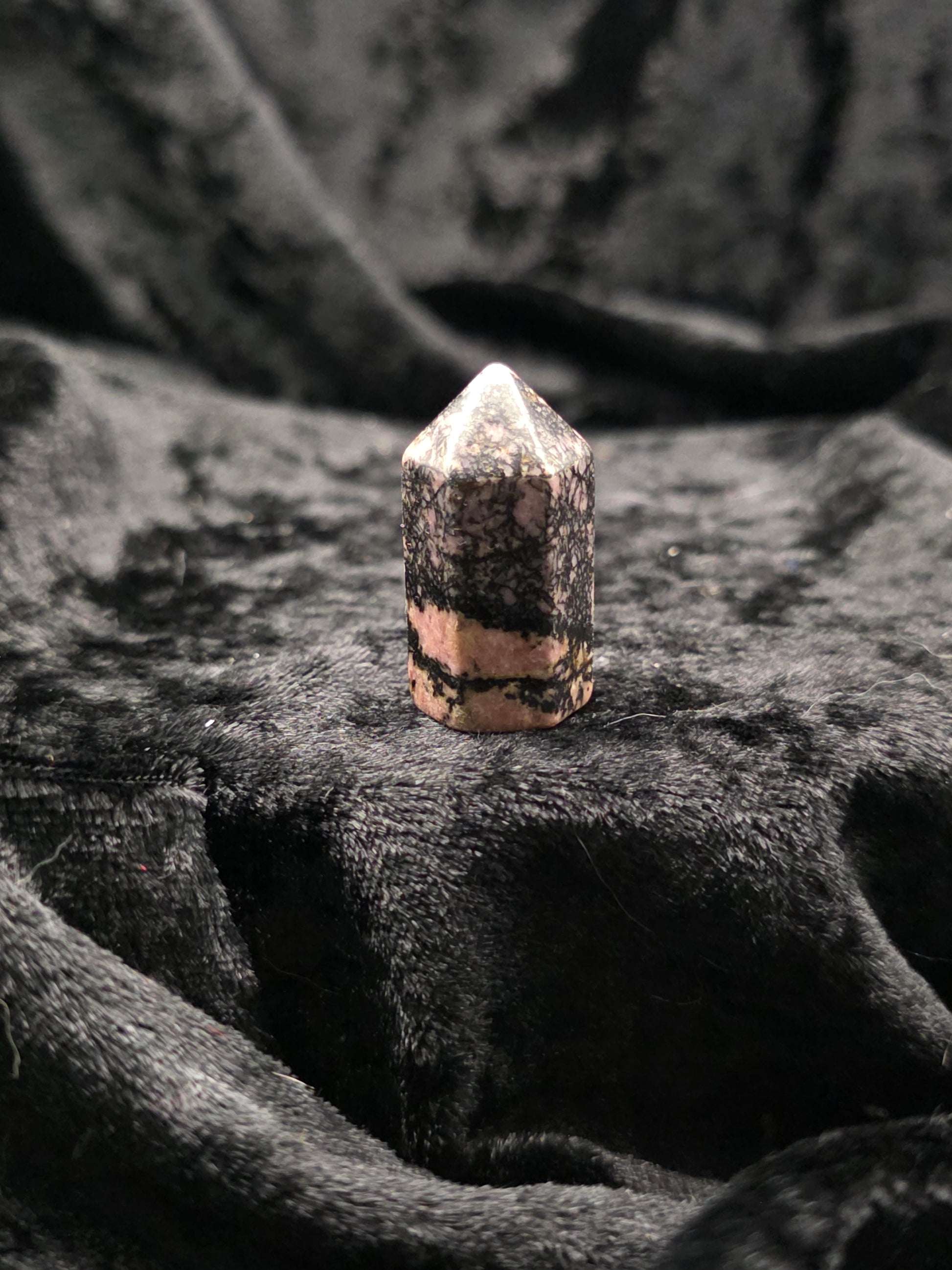 A pocket-sized tower of heart-centered healing. Rhodonite soothes emotional wounds while grounding your energy in strength and compassion.