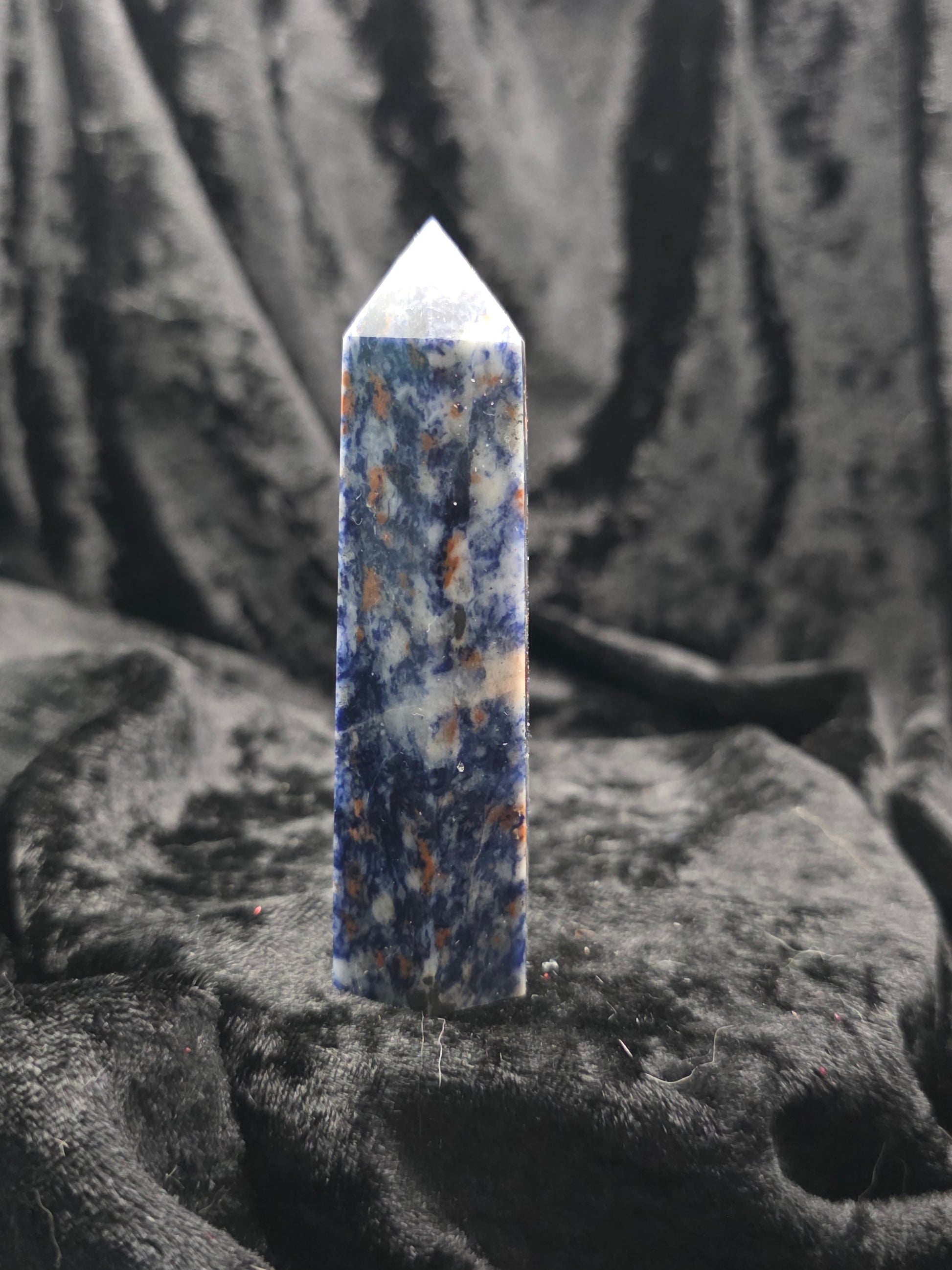 Bold blue hues streaked with white give this 3.5-inch Sodalite tower a commanding yet soothing presence. Its energy supports intuition, balances emotions, and helps you trust your inner compass.