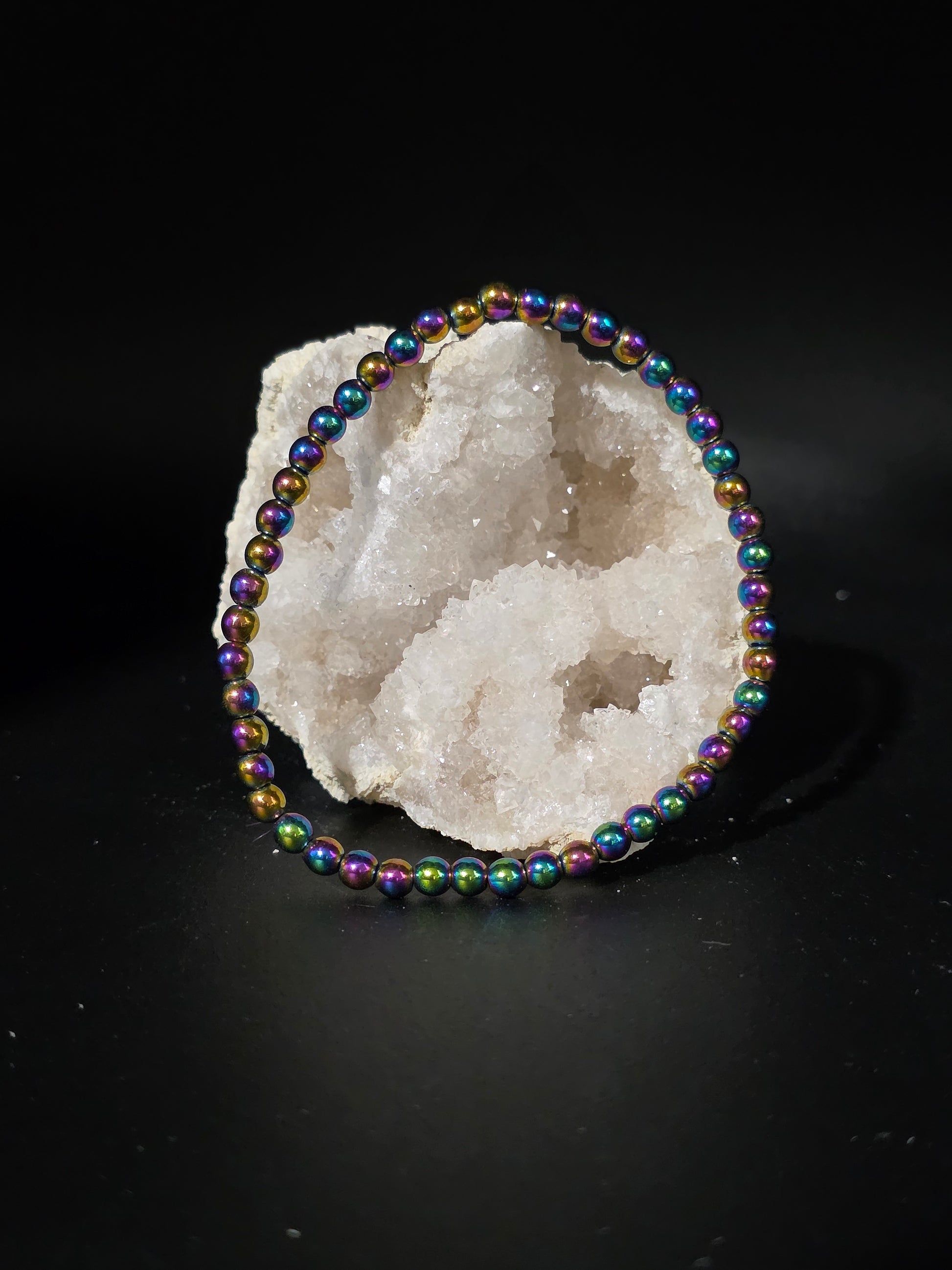 Tiny 4mm Titanium Hematite beads shine with rainbow iridescence, reflecting every color of your aura. This bracelet stabilizes energy while adding a cosmic pop of shimmer to any stack.