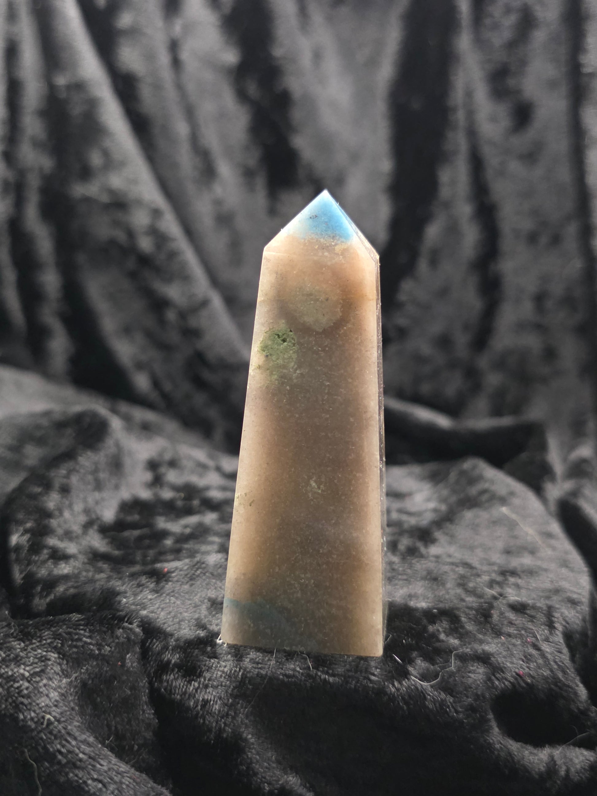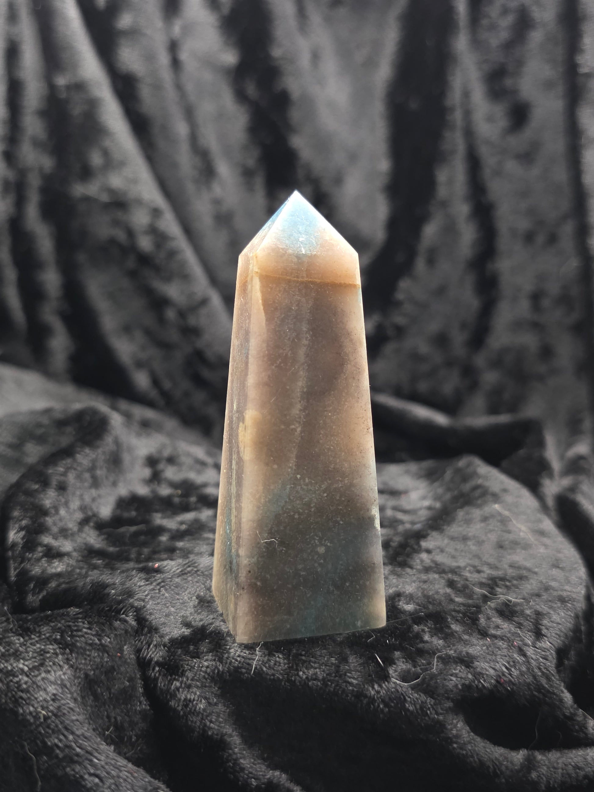 A stormy blue-gray tower with streaks of white light, Trolleite is a stone of spiritual ascension and focus.