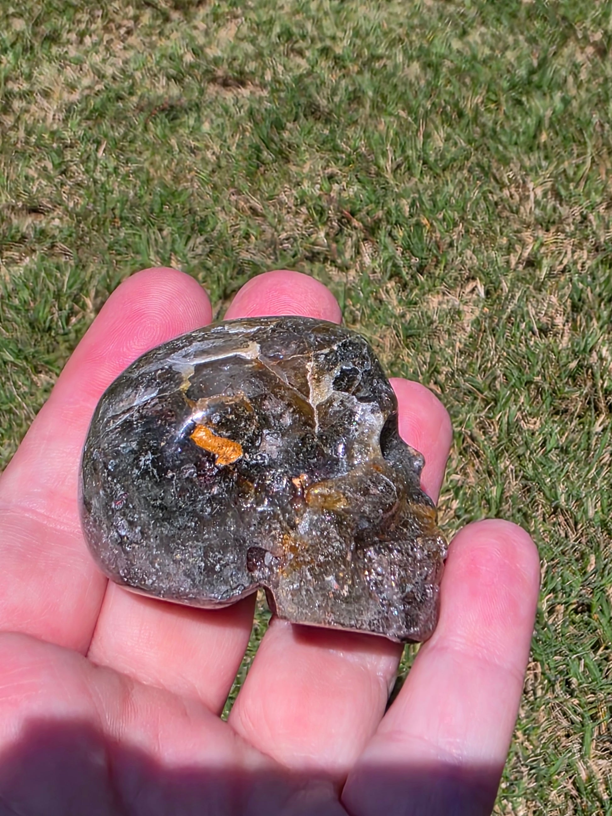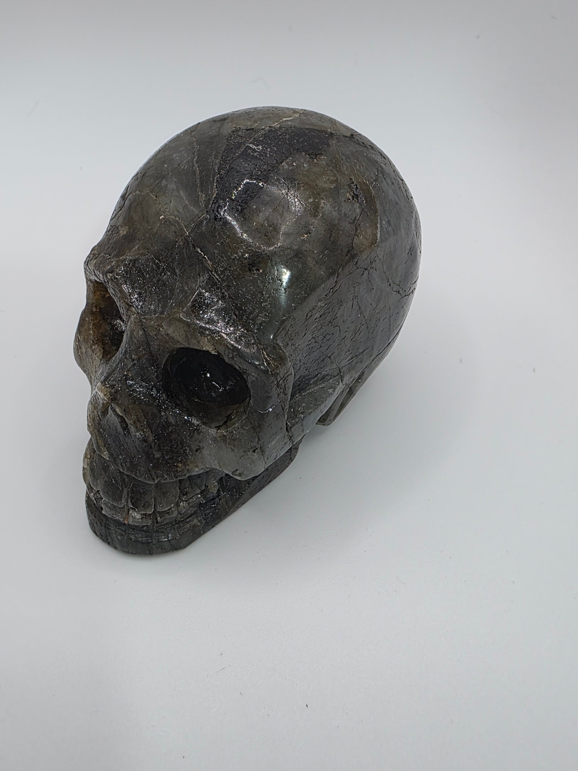 This Labradorite skull shimmers with flashes of gold, green, and blue—the aurora borealis captured in stone. Known as the stone of magic and protection, Labradorite guards the aura while awakening hidden gifts. Its flash dances with light, sparking inspiration and reminding you that transformation is always possible.