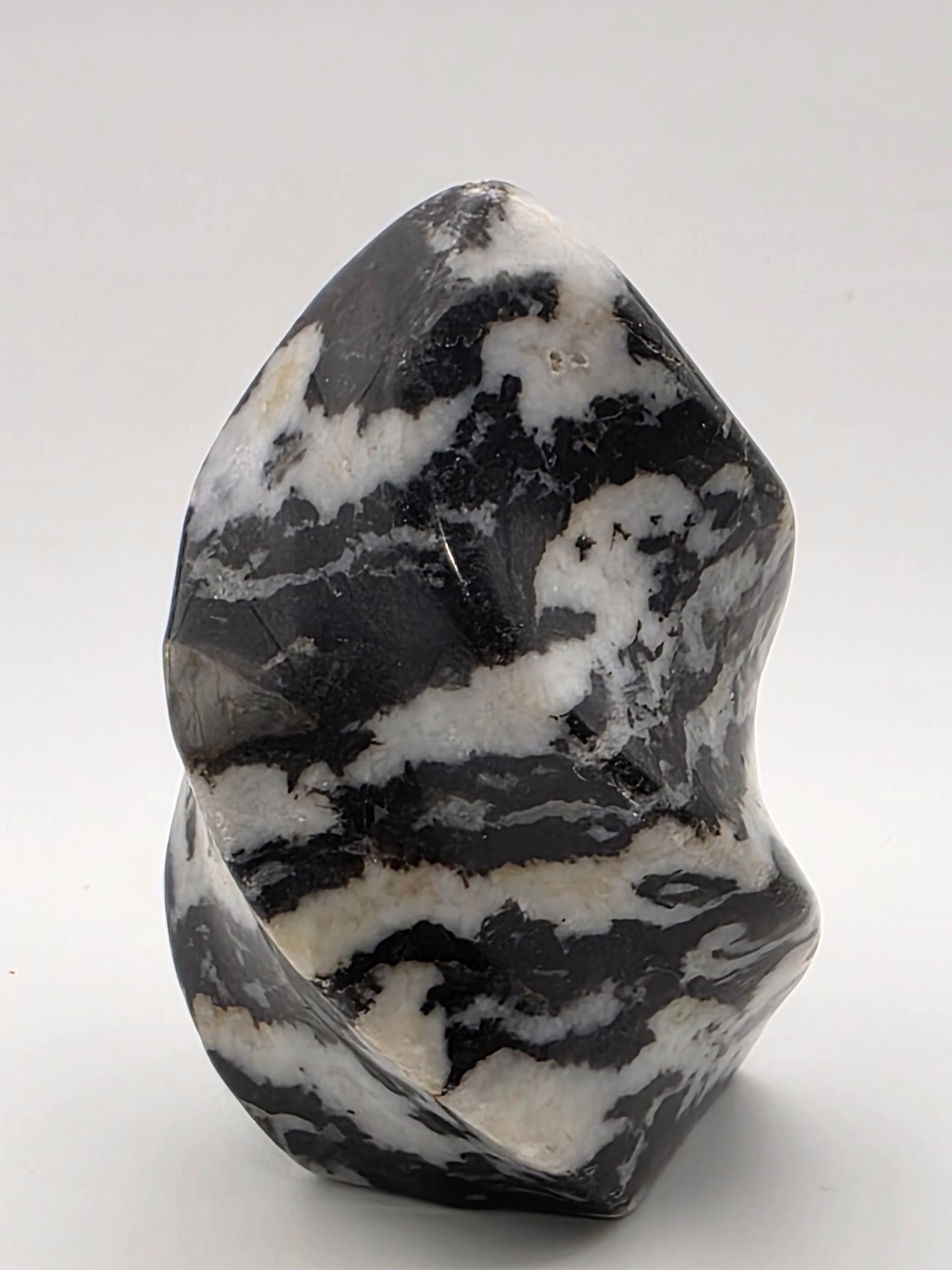Bold bands of black and white dance across this Zebra Jasper flame like yin and yang in motion โ a visual meditation on balance, strength, and radiant calm. Smooth to the touch and grounding to the spirit, this flame embodies the energy of centered power in contrast.